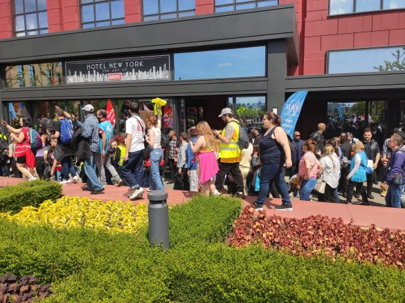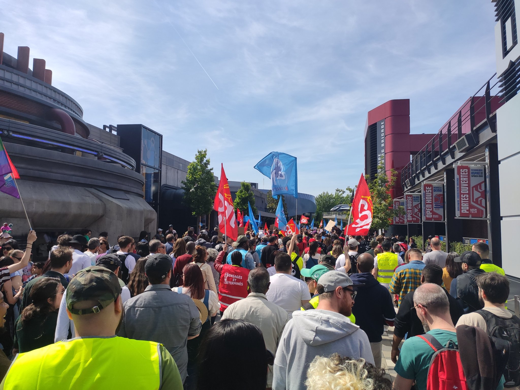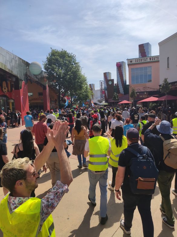 Puis les grévistes ont voulu exporter leur mouvement du côté de Disney Village, des Hôtels Disney et du Lac Disney. On a pu voir la manifestation dans l’allée principale de Disney Village, sur l’esplanade François Truffaut ou devant le Disney Hotel New York – The Art of Marvel ou le Disney Newport Bay Club. La manifestation s’est également arrêtée de nouveau en coulisses, notamment devant le bâtiment Nala. En milieu d’après-midi, le défilé a repris de plus belle sur Central Plaza, empêchant de nouveau le spectacle Rêvons… Et le Monde s’Illumine ! de se jouer.