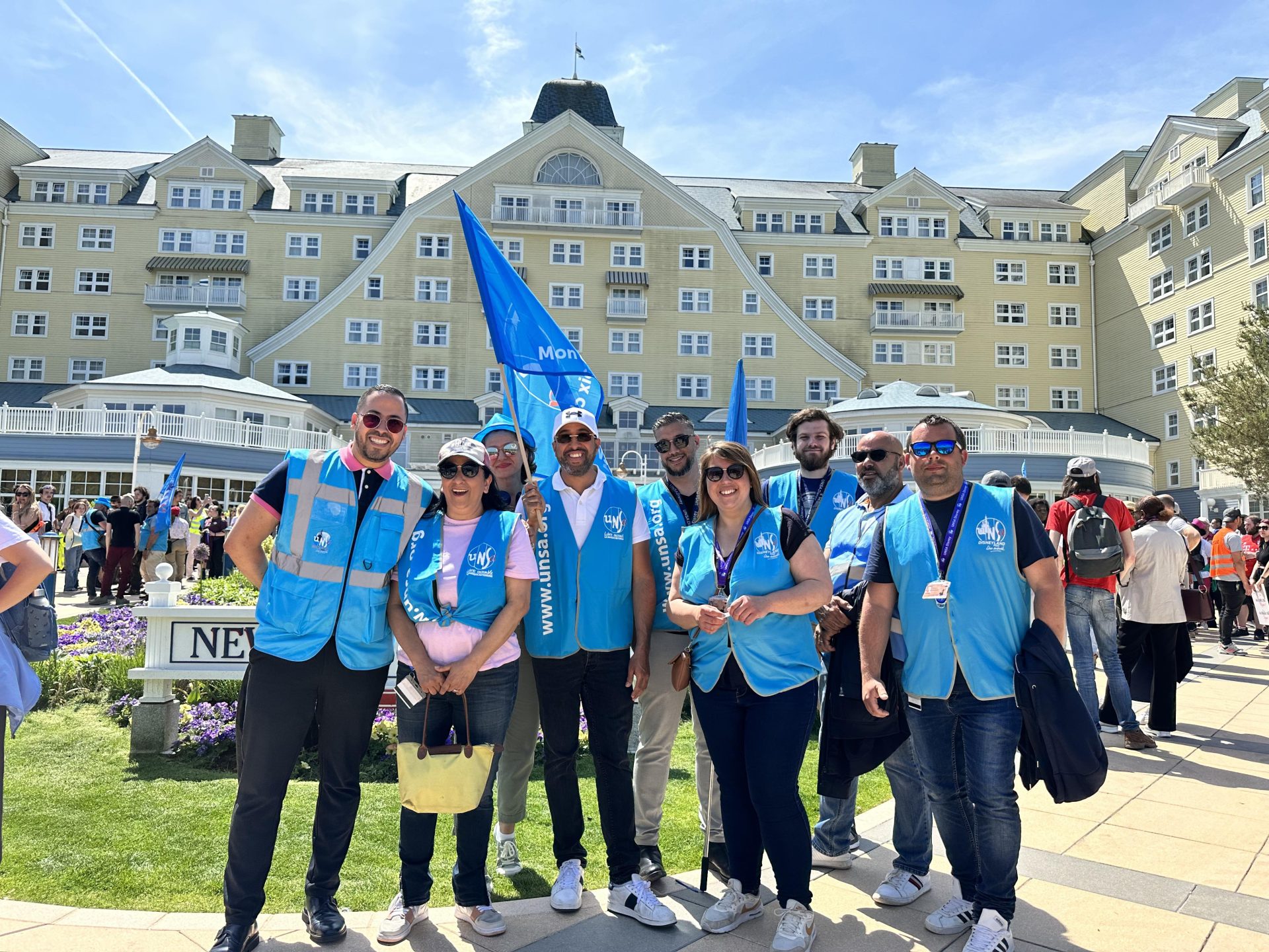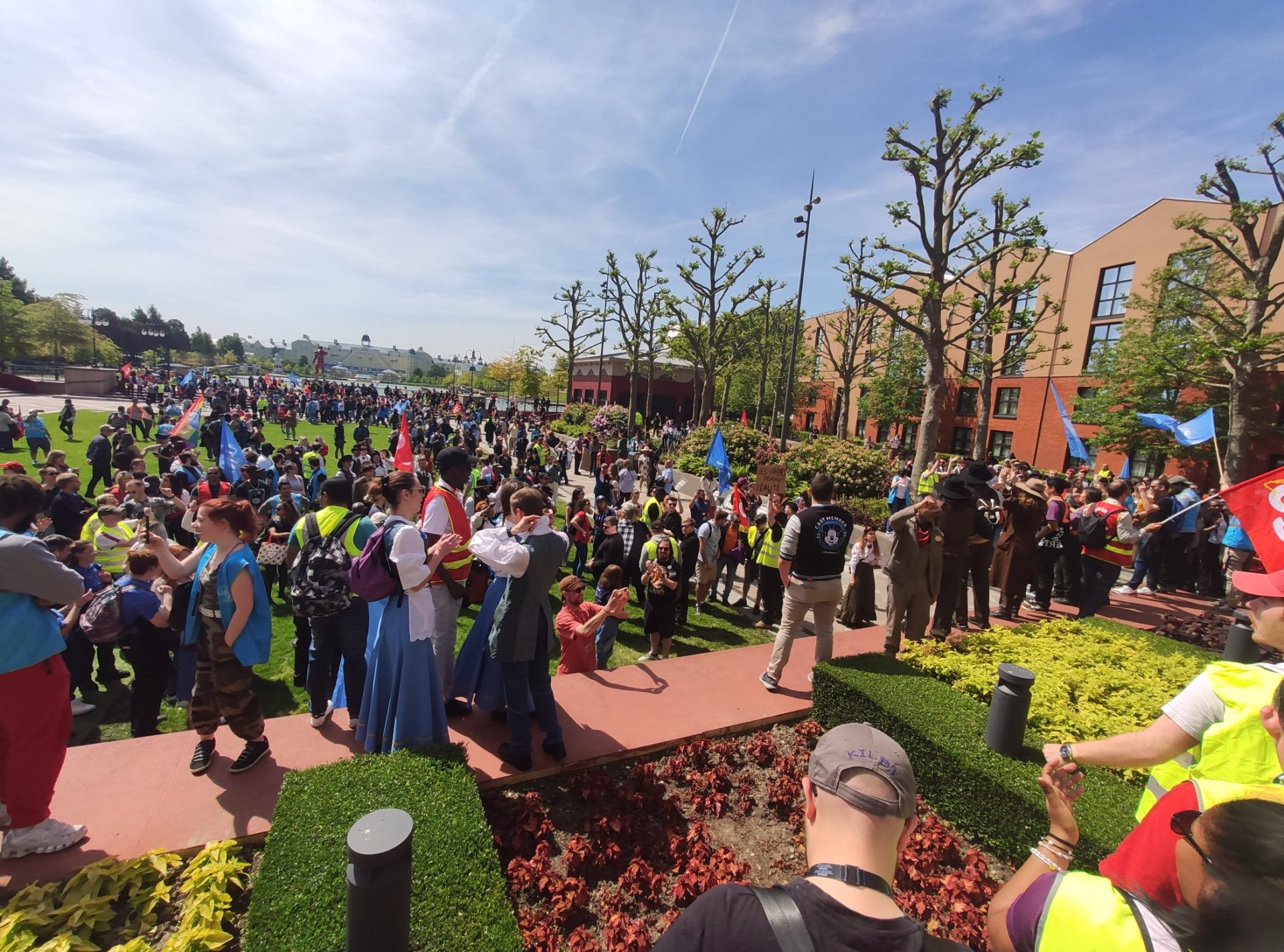Puis les grévistes ont voulu exporter leur mouvement du côté de Disney Village, des Hôtels Disney et du Lac Disney. On a pu voir la manifestation dans l’allée principale de Disney Village, sur l’esplanade François Truffaut ou devant le Disney Hotel New York – The Art of Marvel ou le Disney Newport Bay Club. La manifestation s’est également arrêtée de nouveau en coulisses, notamment devant le bâtiment Nala. En milieu d’après-midi, le défilé a repris de plus belle sur Central Plaza, empêchant de nouveau le spectacle Rêvons… Et le Monde s’Illumine ! de se jouer.