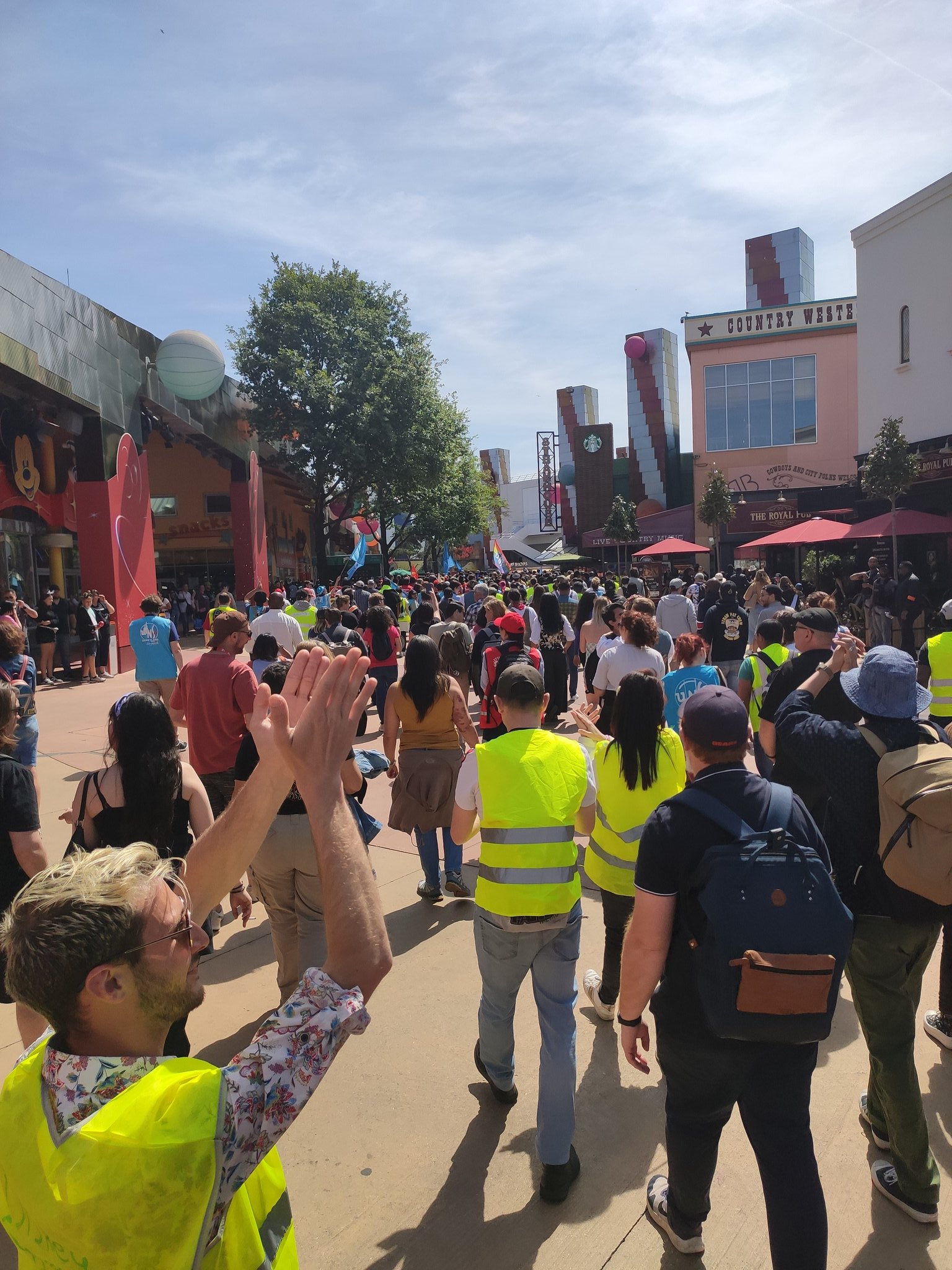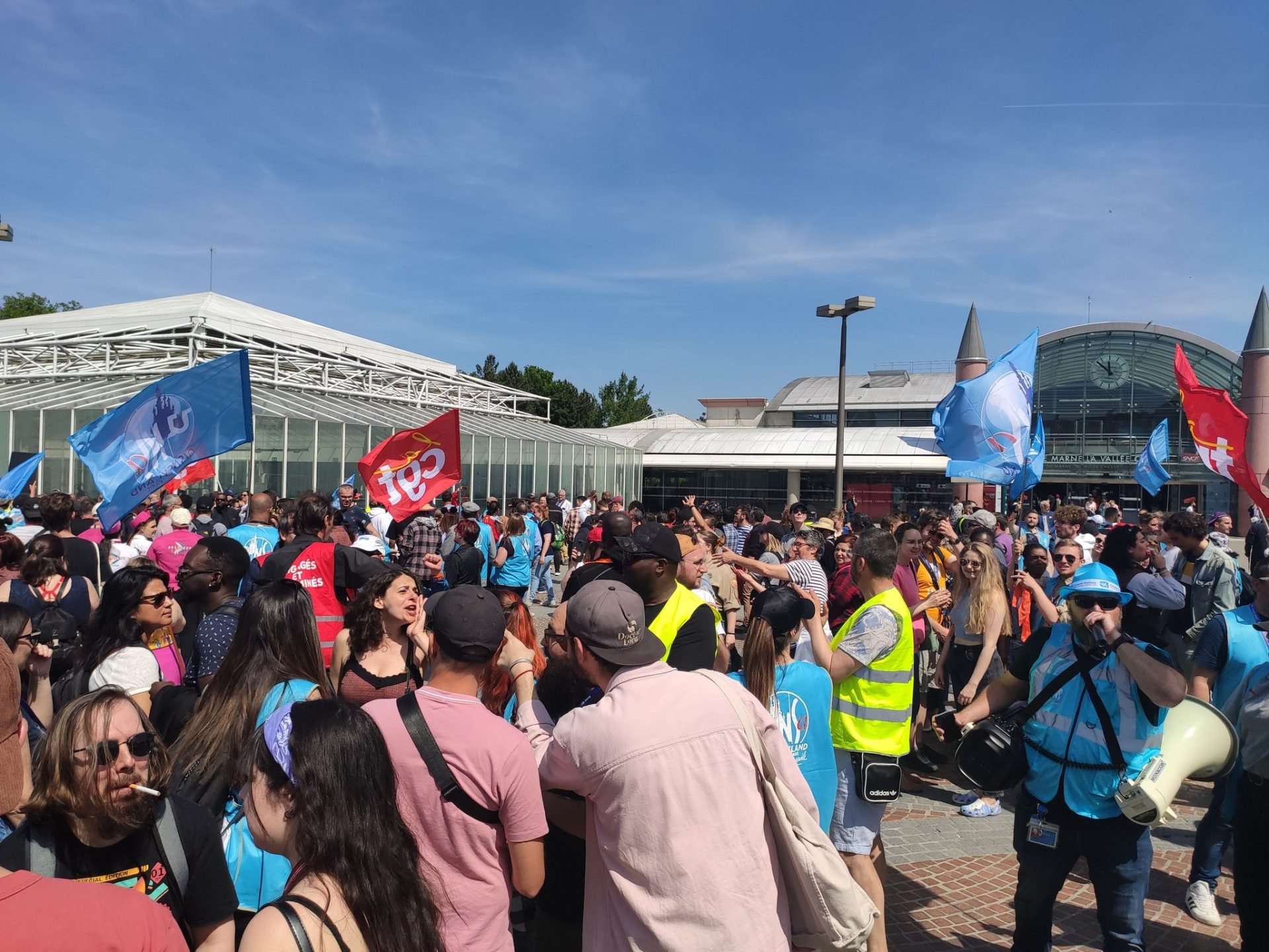 Emmenés par plusieurs syndicats, des centaines de Cast Members se mobilisent aujourd'hui, rassemblés au Parc Disneyland, pour protester contre leurs faibles rémunérations, l'organisation de leurs plannings et le manque d'écoute de la direction de Disneyland Paris. pic.twitter.com/wSRR0X1Fva